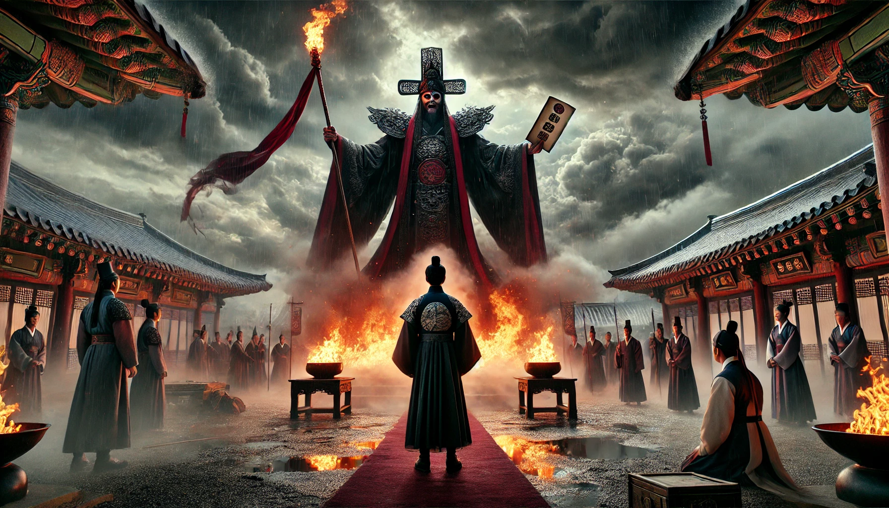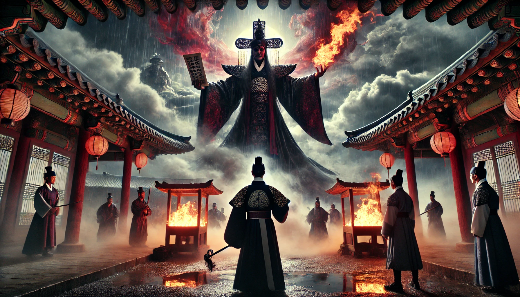 그때 염라대왕이 천천히 일어났습니다. 순간 주변의 온도가 급격히 떨어지고 바람이 불기 시작했습니다.