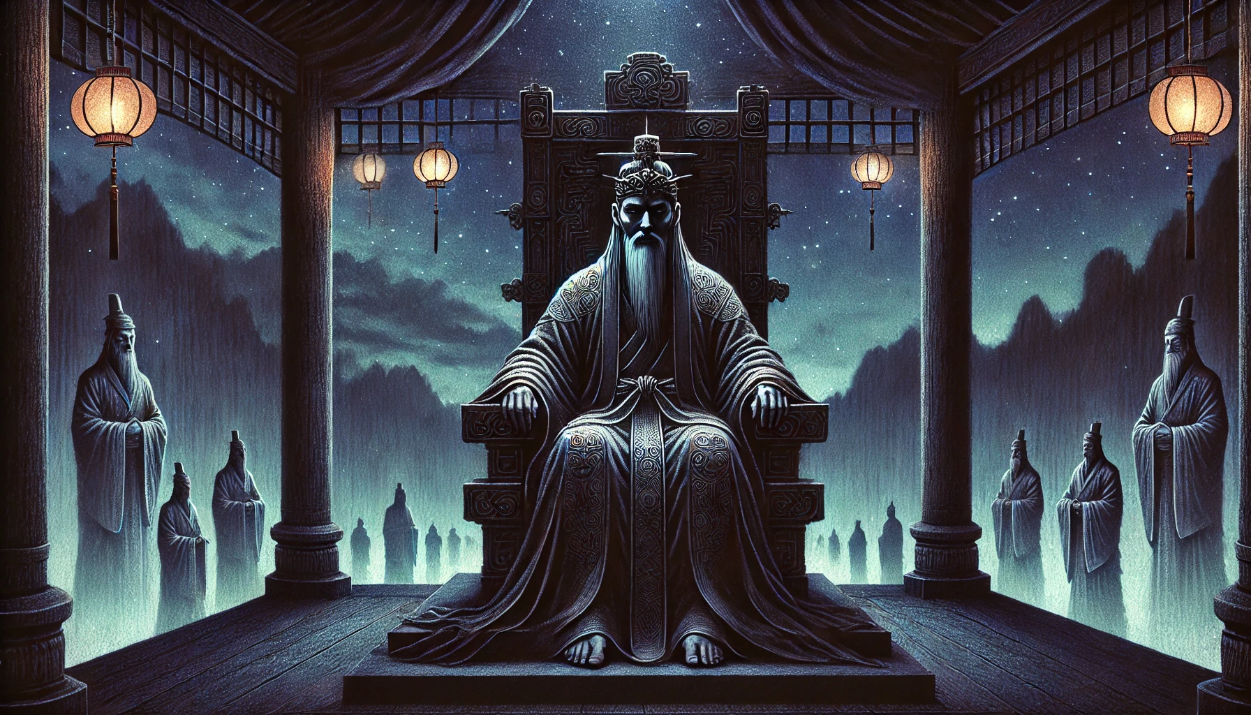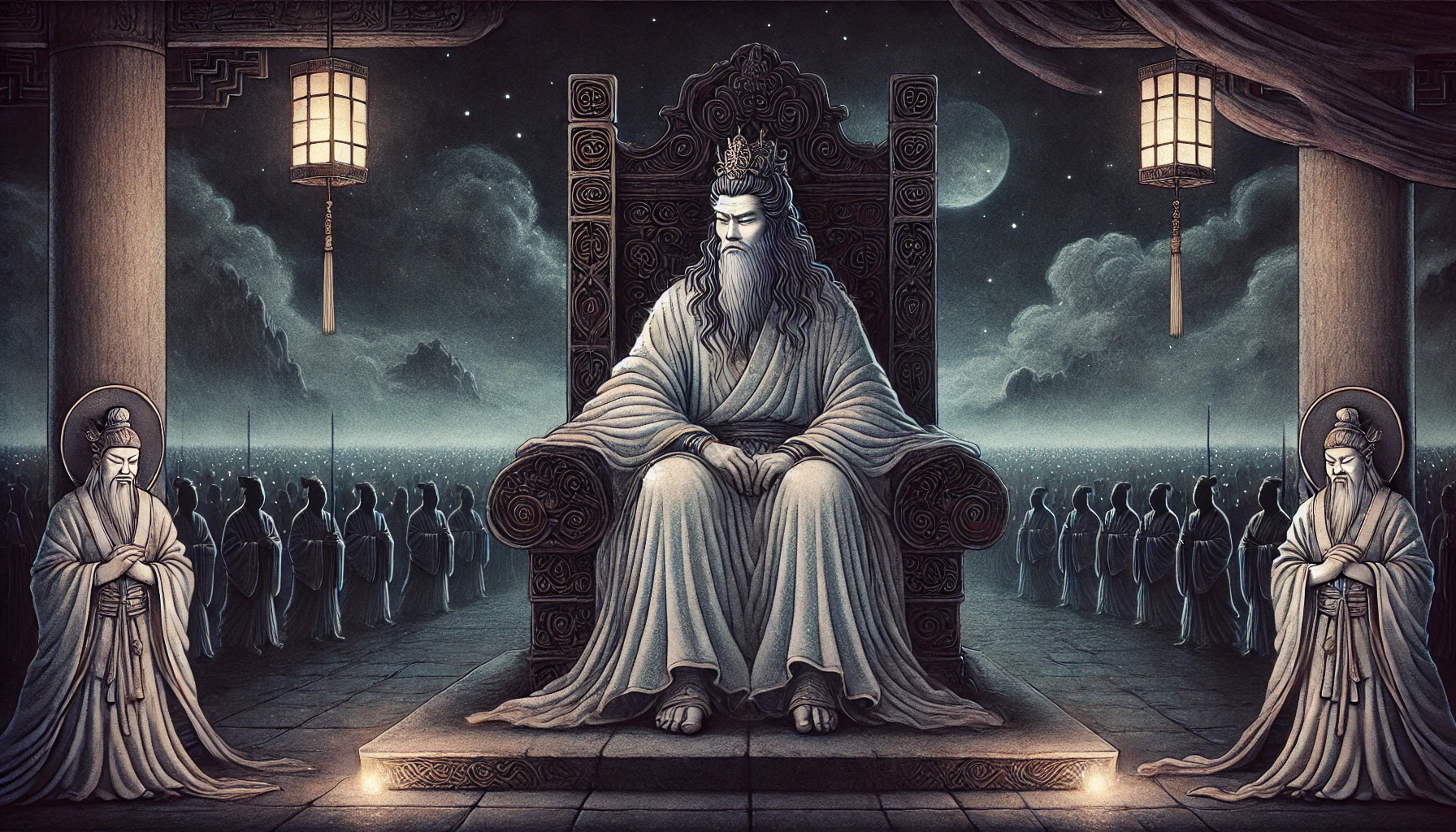 깊고 어두운 지옥의 밤이 찾아왔다. 거대한 명부전 안은 고요하기 이를 데 없고, 황금으로 장식된 왕좌에는 염라대왕이 홀로 앉아 있다. 평소 위엄 넘치던 그의 모습은 온데간데없고, 지친 어깨와 깊은 한숨만이 그를 감싸고 있다. 수천 년을 이어온 이 자리에서 그는 오늘도 혼자만의 시간을 맞이하고 있었다.