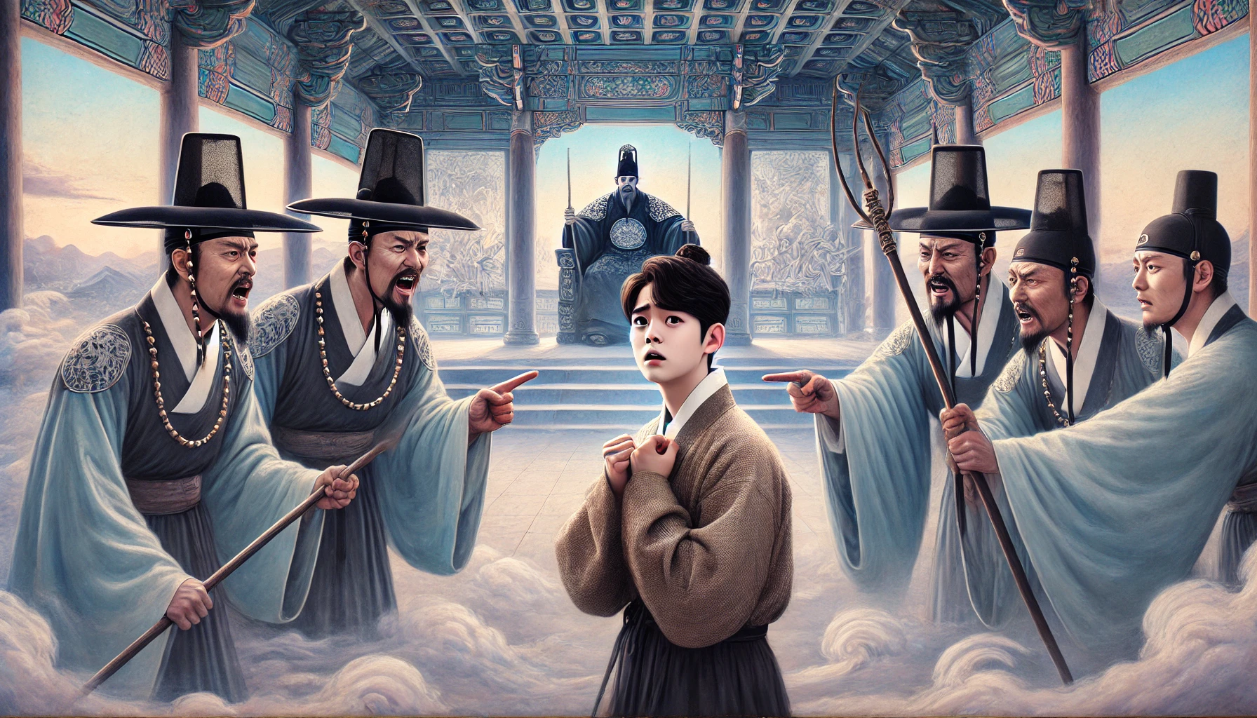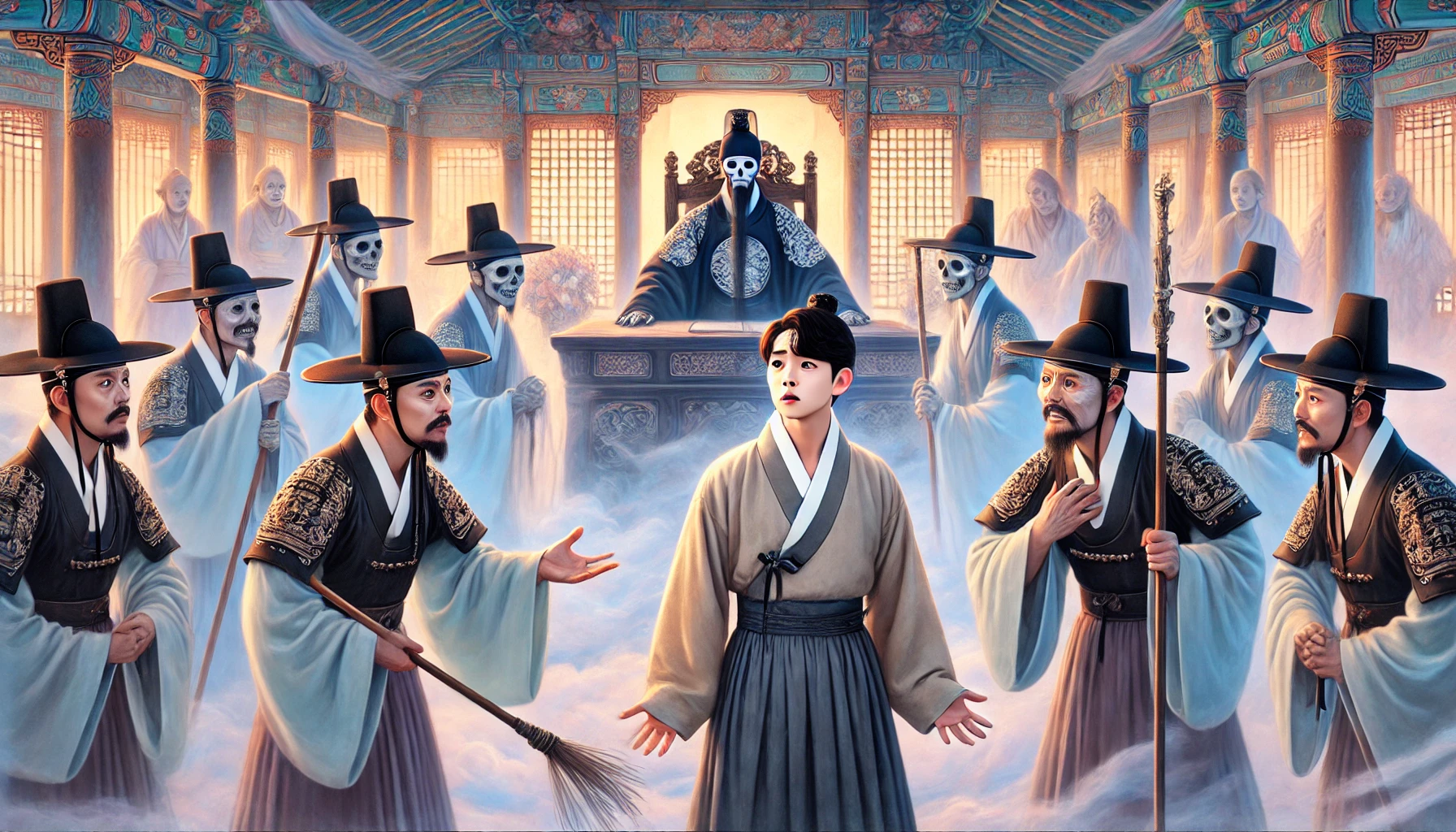 염라대왕의 모습은 실로 공포 그 자체였습니다. 얼굴은 잘 익은 대추처럼 붉다 못해 검붉은 빛을 띠고 있었고, 눈은 마치 밤하늘의 샛별 두 개를 박아놓은 듯 번쩍번쩍 빛나는데, 그 눈빛이 닿는 곳마다 죄인들의 영혼이 타들어 가는 듯했습니다. 빗자루처럼 뻣뻣한 수염은 바람도 없는데 제멋대로 춤을 추었고, 머리에 쓴 관은 온갖 보석으로 장식되어 있었으나 그 빛이 아름답기보다는 서늘하고 날카로웠습니다. 대왕의 옆에는 판관들이 죄인들의 명부를 들고 바쁘게 붓을 놀리고 있었고, 단상 아래에는 죄를 지은 영혼들이 납작 엎드려 숨소리조차 내지 못하고 처분만을 기다리고 있었습니다.