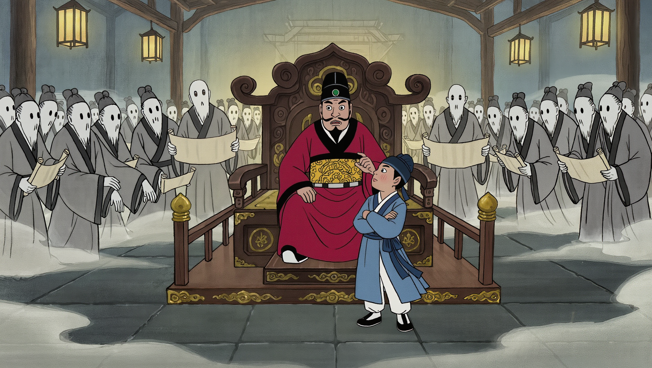 염라대왕의 우렁찬 목소리에 노여움은 사라지고 따뜻한 온기가 감돌기 시작합니다. 대왕은 옆에 있던 판관을 향해 급히 명령을 내립니다. "여봐라, 판관아! 당장 '명부(생명책)'를 대령해라! 이 아이의 수명을 다시 확인해야겠다! 내 직권으로 운명을 고쳐야 쓰겠다!"