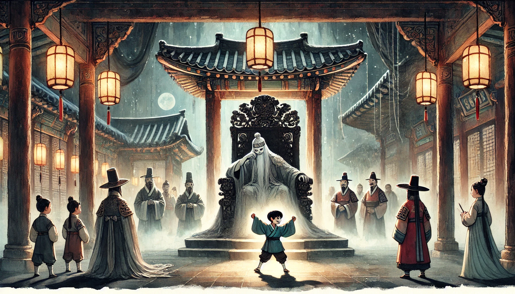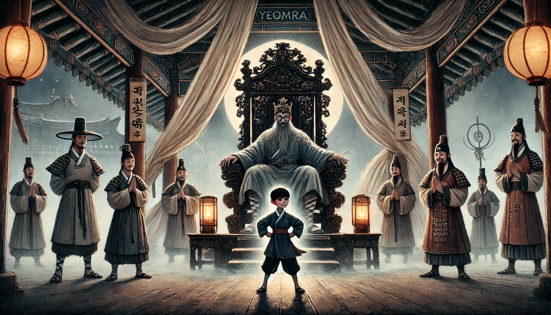 돌석이의 울음소리가 염라전의 높은 천장을 때리고, 지옥의 바닥까지 쩌렁쩌렁 울려 퍼집니다. 그 처절하고도 순수한 효심에, 서슬 퍼런 옥졸들도 창을 내려놓고 코를 훌쩍이고, 냉철하기로 소문난 판관마저 소매로 눈물을 훔치니, 염라전이 순식간에 눈물바다가 되고 말았습니다. 천하를 호령하는 염라대왕인들 이 맹랑한 꼬마의 진심 앞에 어찌 버티겠습니까. 염라대왕이 마침내 무릎을 ‘탁!’ 하고 내려치며 소리칩니다.