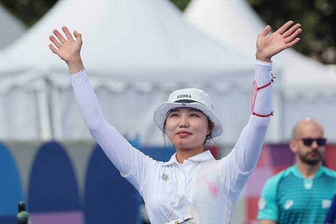 여자 대표팀 에이스 임시현(한국체대)은 3일 프랑스 파리의 앵발리드에서 열린 대회 양궁 여자 개인전 준결승에서 전훈영을 세트점수 6-4(28-28 26-29 27-27 29-26 29-17)로 제압했다.