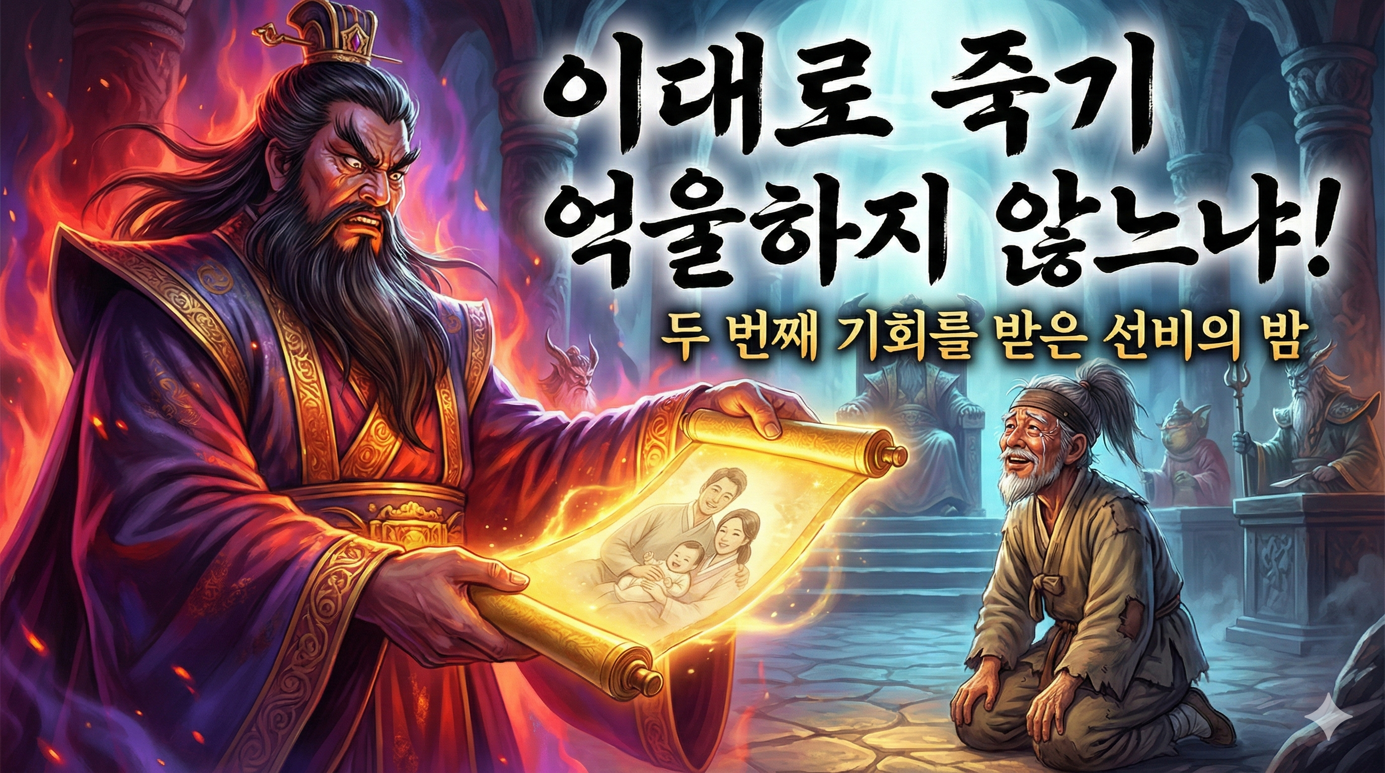염라대왕의 목소리가 엄숙하면서도 부드럽게 잦아들었습니다. 만석은 차가운 법정 바닥에 이마를 찧으며 오열했습니다. 살고 싶어졌습니다. 미치도록 살아서, 거칠어진 아내의 손을 잡아주고 싶고, 태어날 손주의 보드라운 뺨을 비벼보고 싶어졌습니다.
