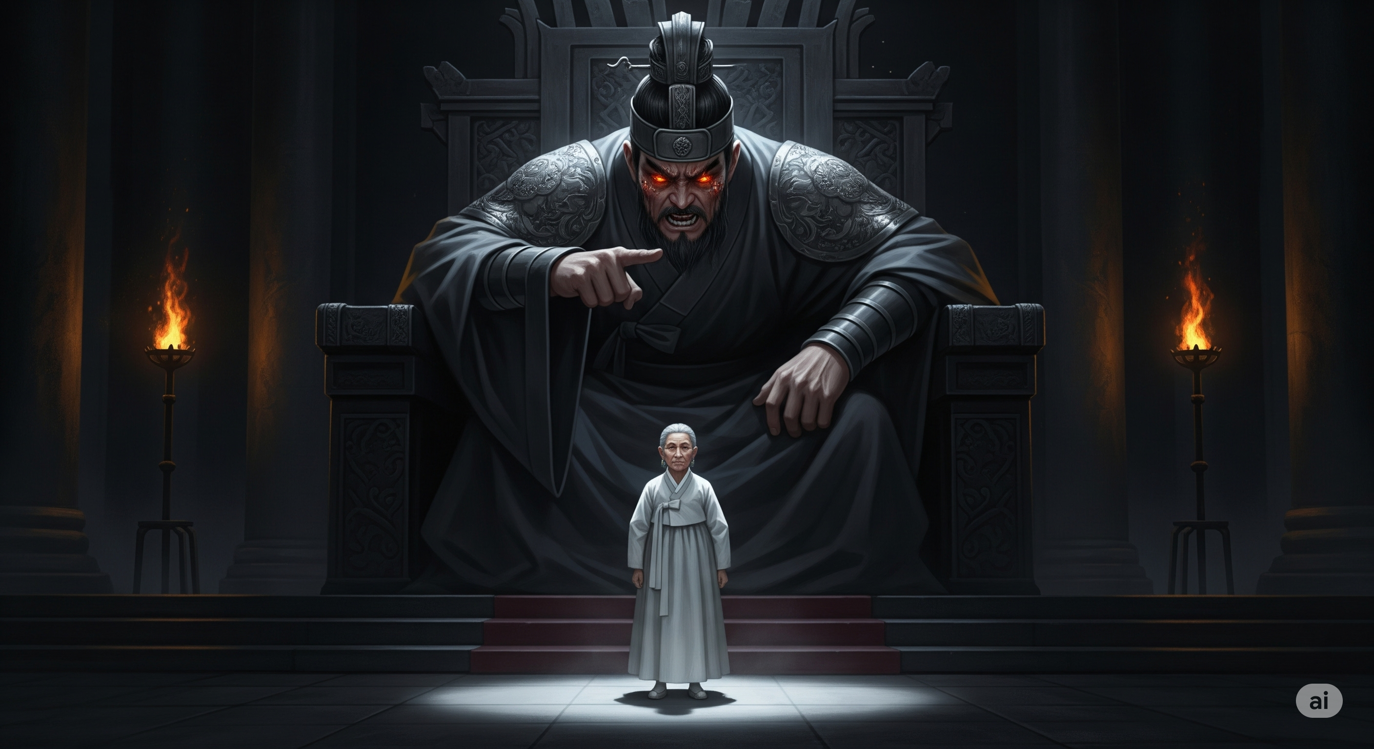 여기는 빛 한 줌 들지 않는 깊고 깊은 땅속, 망자들이 모여든다는 명부(冥府)의 세계. 사방에서는 정처 없이 떠도는 혼령들의 울음소리가 메아리치고, 코를 찌르는 유황 냄새와 피비린내가 진동했다. 거대한 옥문(獄門)을 지나자, 수만 개의 촛불이 일렁이며 거대한 법정을 밝혔다. 법정의 가장 높은 단상 위에는 집채만 한 거구의 사내가 앉아 있으니, 검은 관복에 무시무시한 얼굴, 눈빛만으로도 능히 산 자의 간담을 서늘하게 만드는 저승의 군주, 염라대왕이었다.