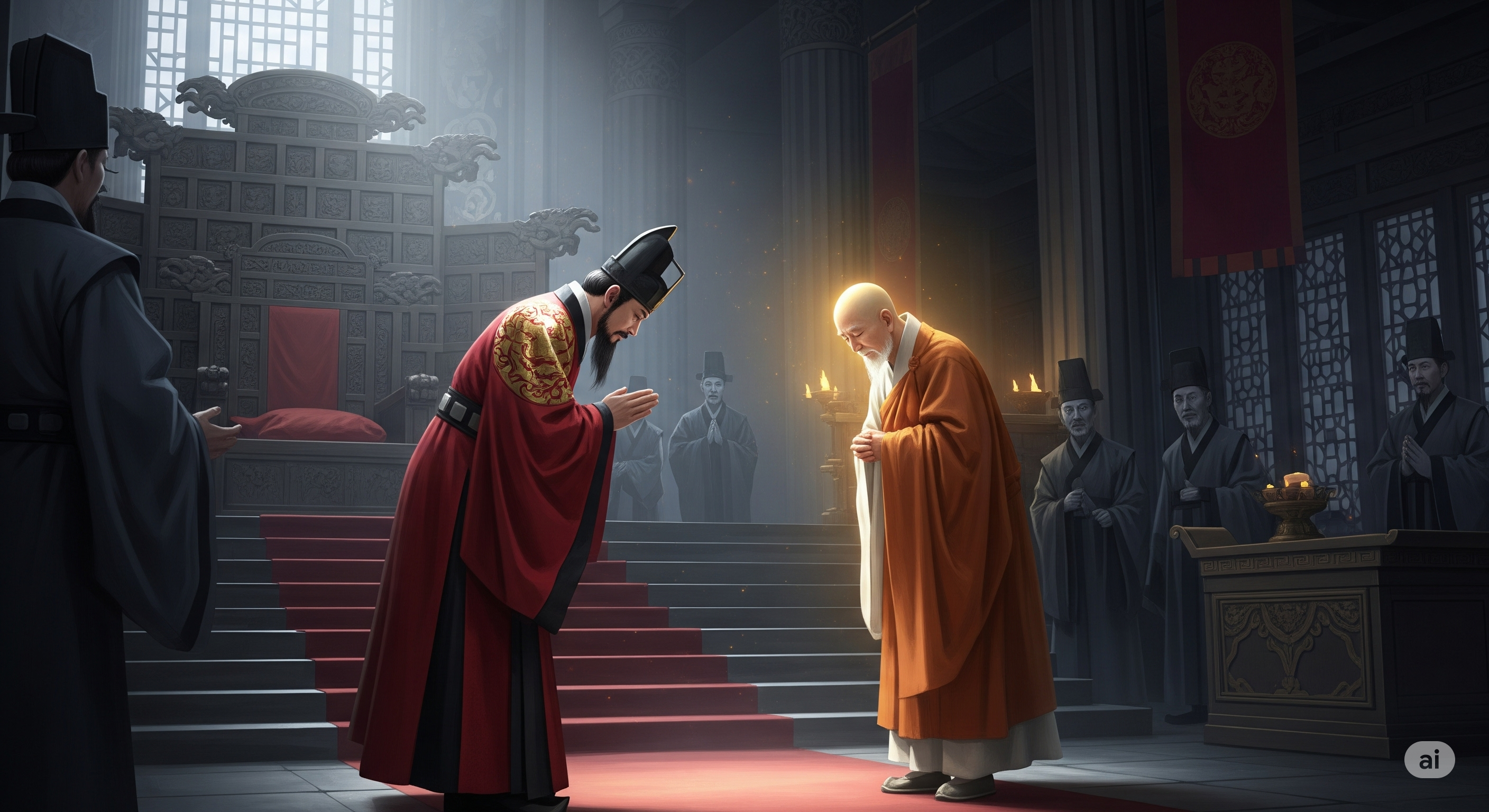 해안 스님은 합장하며 조용히 답했다. “예, 대왕님. 소납이 바로 해안입니다. 어찌하여 이곳에 오게 되었는지… 여쭙고자 합니다.”