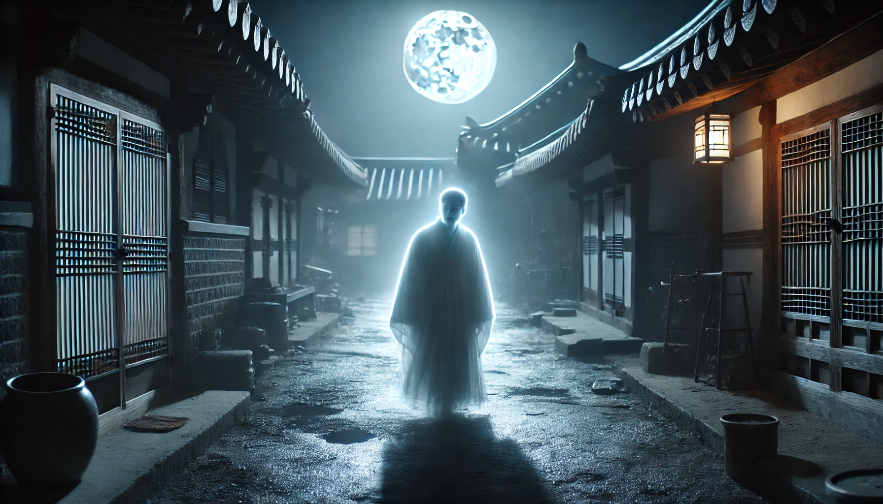 셋째 날 밤, 이현성은 안개가 자욱한 저승의 경계를 지나 인간 세상으로 돌아왔습니다. 그의 발걸음이 닿은 곳은 자신이 죽음을 맞이했던 서재였습니다. 달빛이 창문을 통해 흘러들어와 마루에 쓰러져 있던 그날의 흔적을 비추고 있었지요. 하지만 이제 그곳에는 아무도 없었습니다.