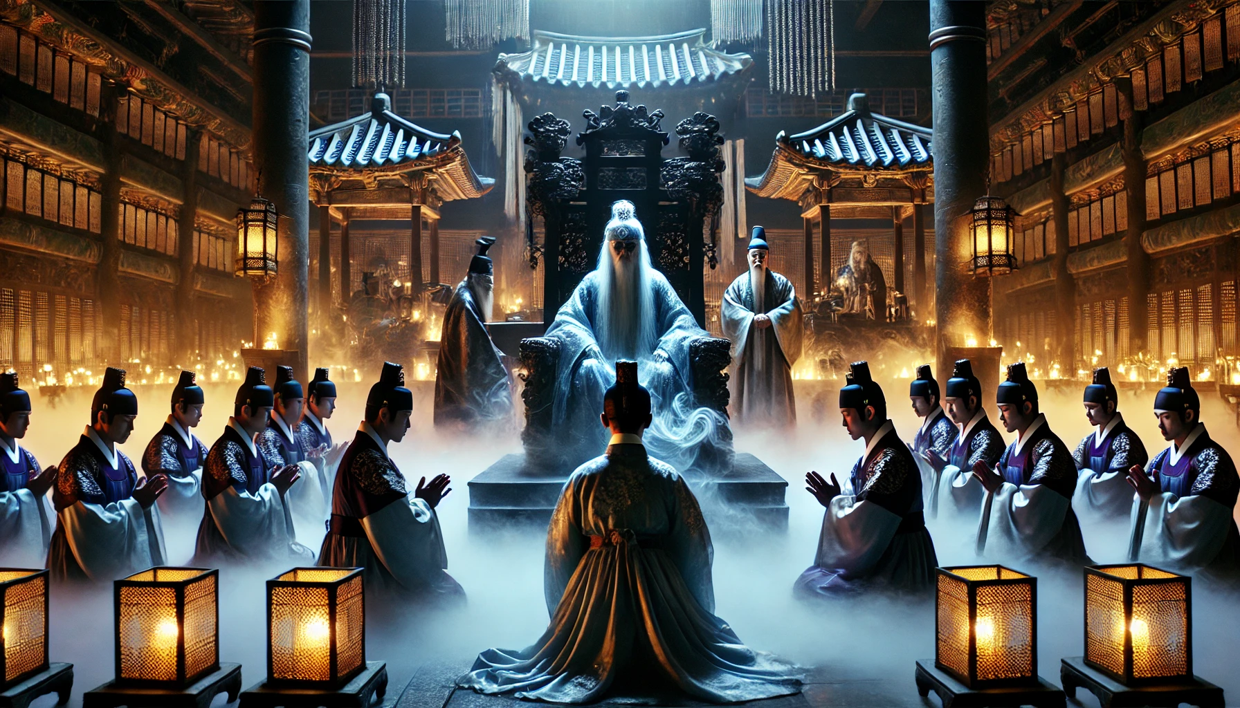안개 속을 걷는 시간이 얼마나 흘렀을까요. 이현성은 거대한 저승 법정 앞에 도착했습니다. 높은 대전 위에는 염라대왕이 앉아 있었고, 그 앞에는 생전의 죄와 선행을 기록한 생사책이 펼쳐져 있었습니다. 좌우로는 판관들이 줄지어 서 있었지요.