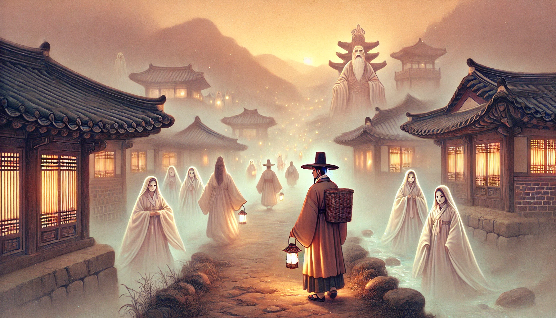 이제야 주위를 자세히 살펴볼 수 있었습니다. 저승은 낯설면서도 어딘가 친숙했습니다. 마치 오래전 꿈에서 본 듯한 풍경이었지요. 기와집들은 이승의 것과 비슷했지만, 처마 끝이 하늘로 살짝 휘어 올라가 있었고, 담장은 회색빛이 도는 옥처럼 반투명했습니다.