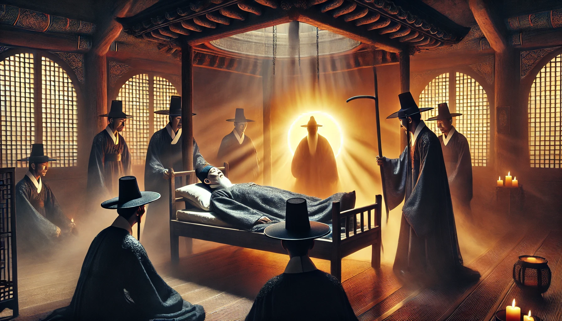 그의 말이 끝나기도 전에, 마당 입구에 검은 도포를 입은 세 명의 저승사자가 나타났습니다. 그들의 얼굴은 공포와 위엄으로 가득 차 있었고, 손에는 영혼을 거두는 죽장을 들고 있었습니다. 땅의 기운이 흔들리고, 바람이 멈추었습니다. 새들은 더 이상 지저귀지 않았고, 꽃들은 고개를 숙였습니다.