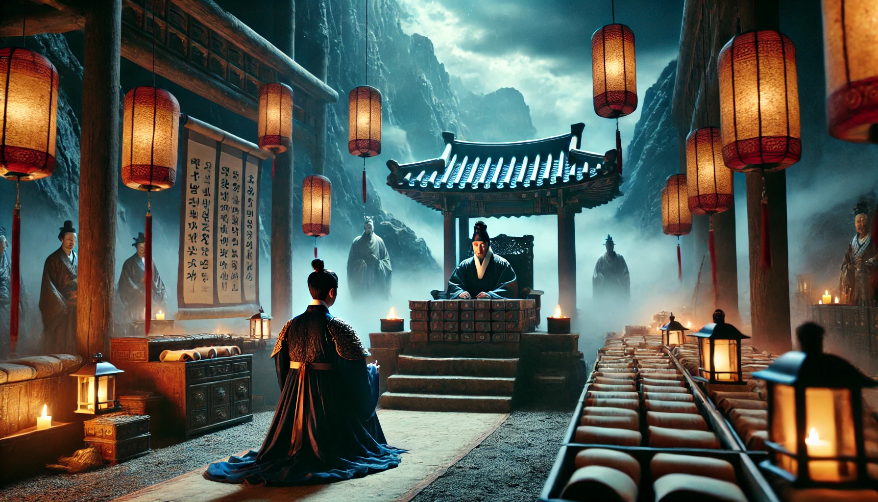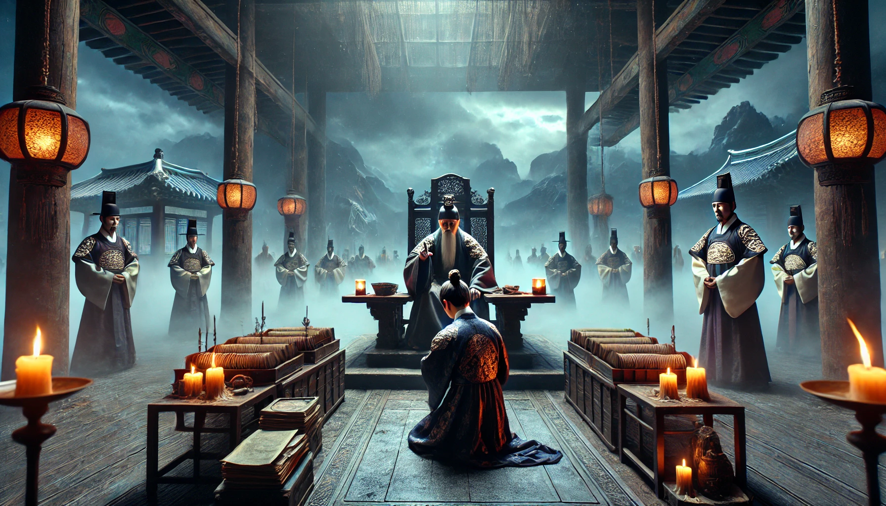 궁 안으로 들어가니 넓은 마당이 있었고, 그 끝에 커다란 전각이 서 있었습니다. 전각 안으로 들어가니 높은 단 위에 위엄 있는 모습의 염라대왕이 앉아 있었습니다. 왕관을 쓰고 용포를 입은 염라대왕의 눈빛은 예리했고, 주변에는 여러 관리들이 서 있었습니다.