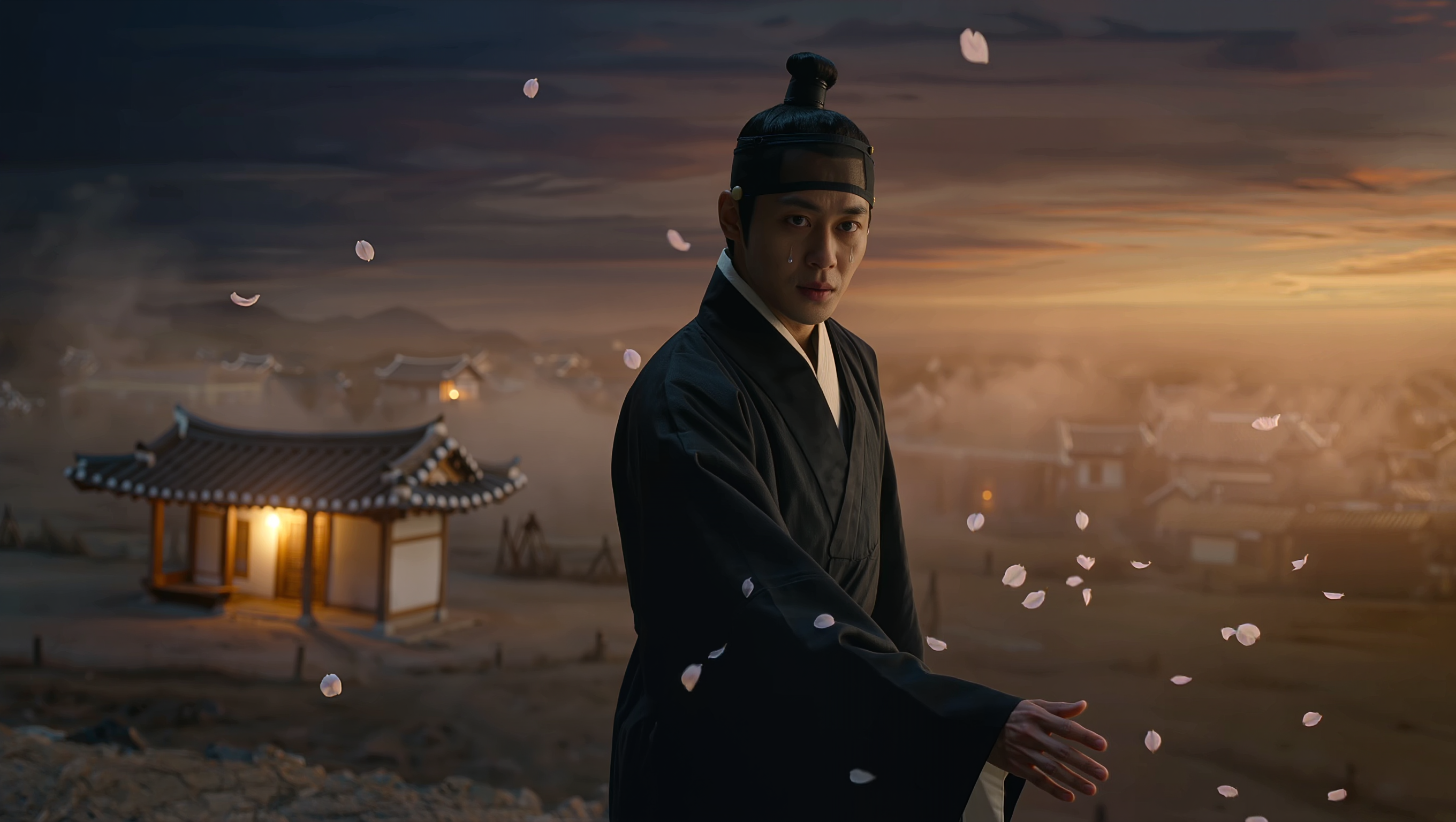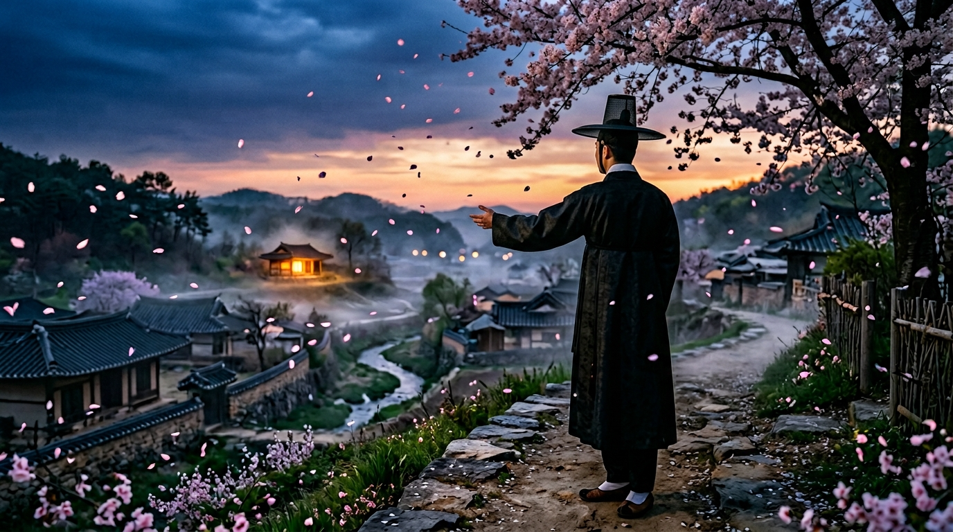 A photorealistic cinematic scene in 16:9 aspect ratio, a lone figure in a black traditional Korean dopo robe standing at the edge of a misty village at twilight, his hand slightly reaching forward toward a warm golden light emanating from a small hanok house in the distance, the sky is deep indigo blending into amber on the horizon, cherry blossom petals drifting in the wind, the figure's face partially hidden in shadow revealing only a single tear glistening on his cheek, no text, ultra realistic, dramatic lighting, shallow depth of field