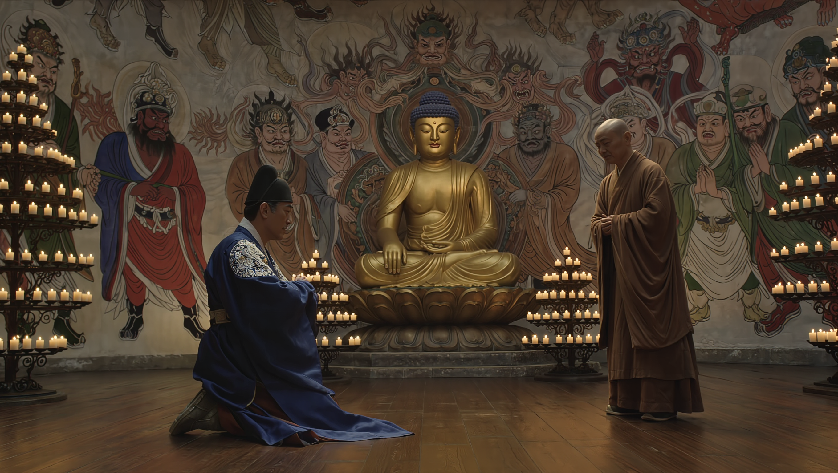 [씬3 이미지 프롬프트 B] Photorealistic Joseon dynasty scene, interior of a dimly lit Buddhist Myeongbu-jeon temple hall, a Korean magistrate in hanbok with gat hat standing transfixed before a wall mural showing a giant bronze mirror reflecting a sinner's hidden crimes, an elderly monk explaining beside him, dramatic candlelight creating deep shadows, 16:9 aspect ratio, no text