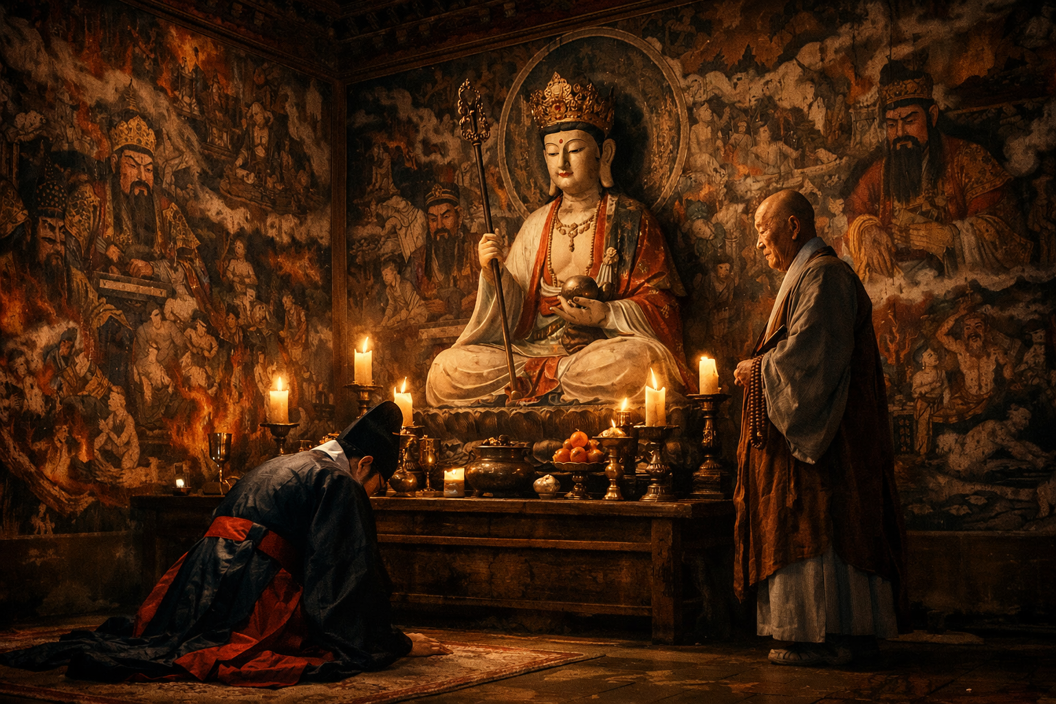 Epic photorealistic wide panoramic shot of a Joseon dynasty Korean Buddhist temple Myeongbu-jeon interior, dramatic candlelight illuminating vivid traditional Ten Kings of the Underworld mural paintings covering the walls, a Korean magistrate in formal hanbok kneeling in repentance before a serene Jizo Bodhisattva statue, an elderly monk standing compassionately nearby, the contrast between terrifying hell murals and the warm glow of compassion from the Buddha statue, cinematic atmospheric lighting, 16:9 aspect ratio, no text