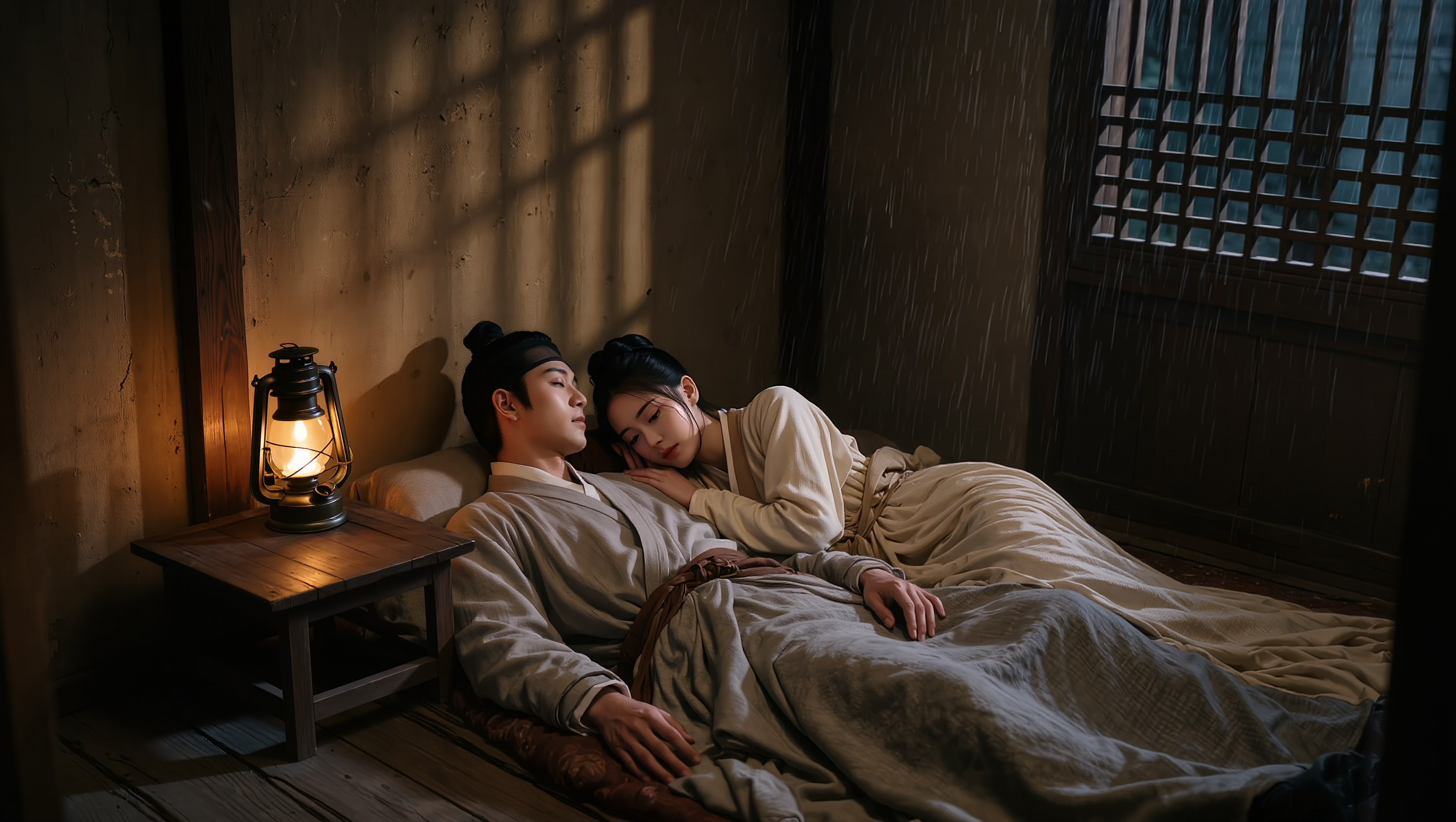 Cinematic night shot, interior of a small thatched cottage, heavy rain falling outside, dim candlelight inside, silhouettes of a couple (Lee Saeng and Seo-ssi) embracing passionately on the bedding, sound of rain and breathing, intimate and sensual atmosphere.