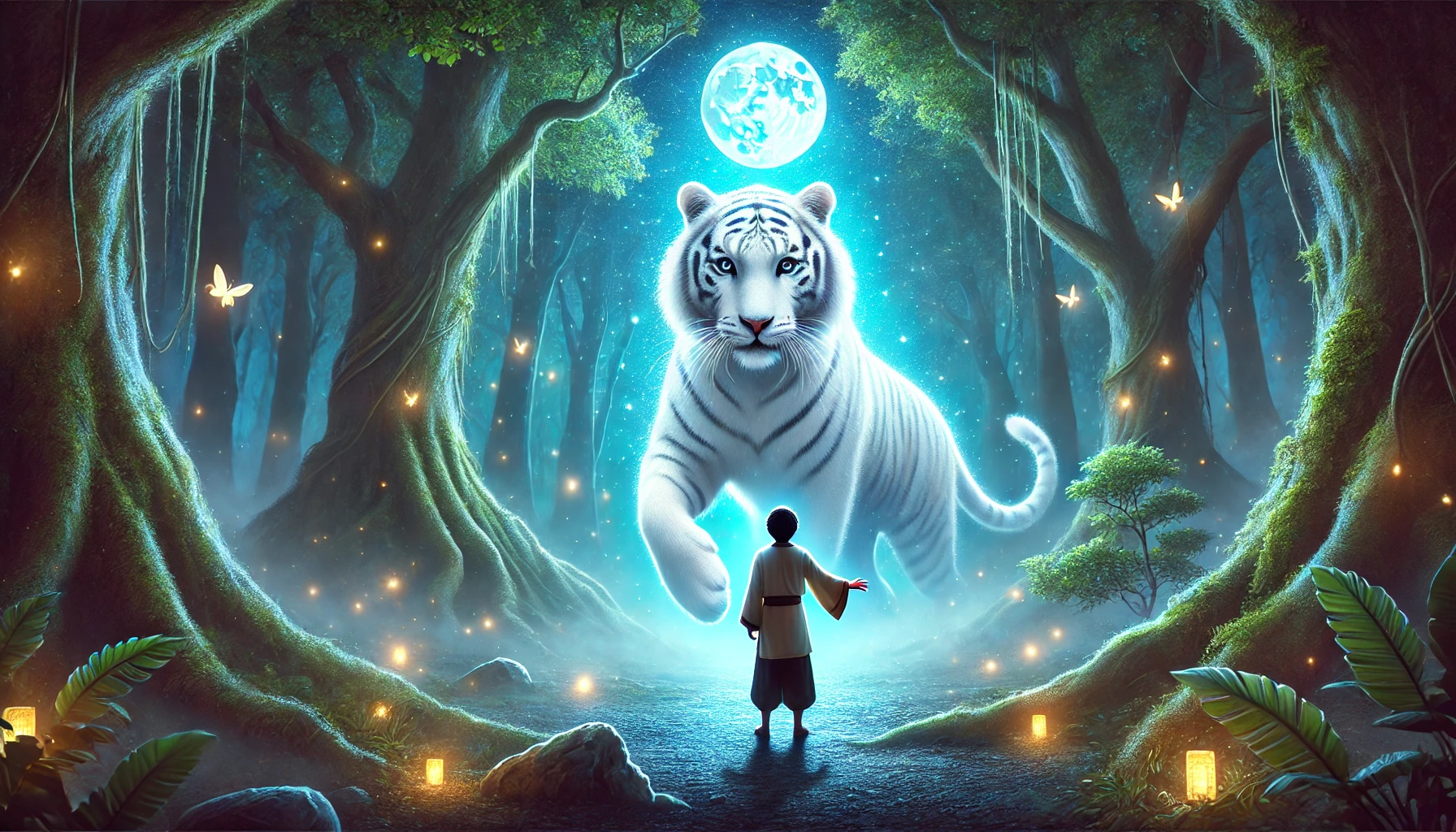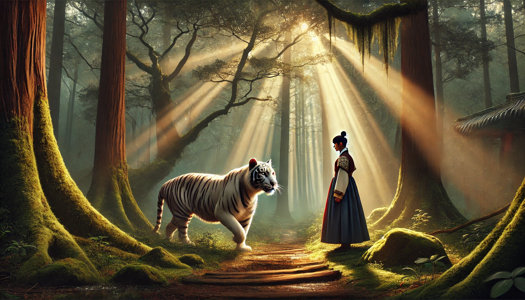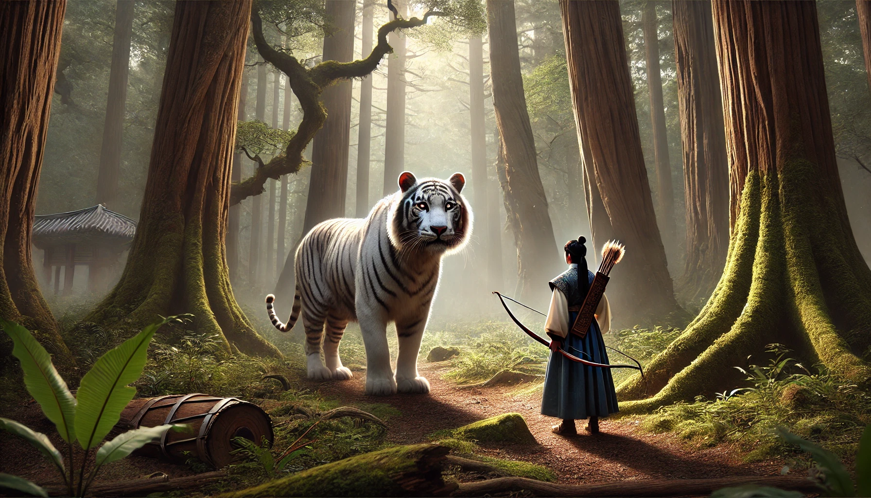 그가 도착한 곳은 숲 속의 작은 빈터였다. 빈터 한가운데에는 하얗고 웅장한 호랑이가 서 있었다. 백호는 달빛 아래에서 은은하게 빛나고 있었고, 그 눈은 마치 사람처럼 깊은 지혜와 위엄을 품고 있었다.