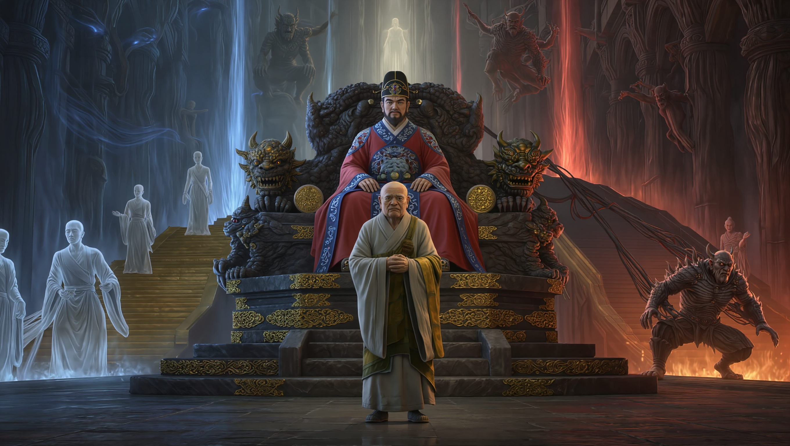 "염라전으로 향하고 있습니다. 대왕 앞에서 생전의 업을 심판받기 위해서입니다." 저승사자가 대답했다. "스님께서도 곧 그곳에 가실 것입니다."
