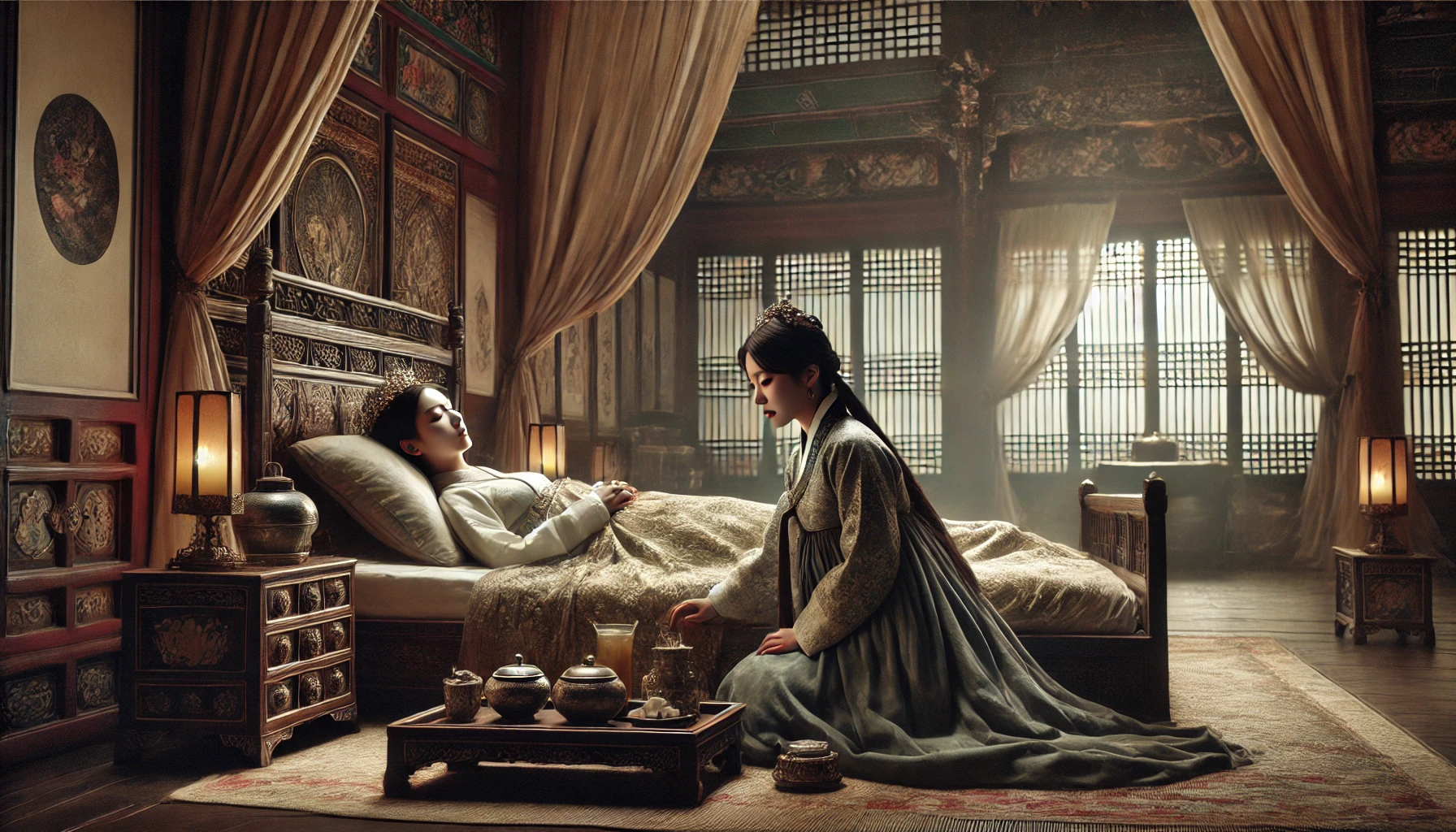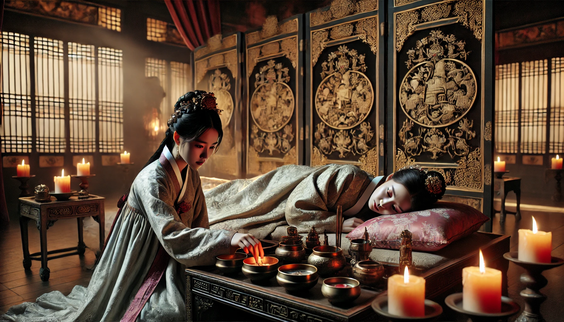 홍설의 떨리는 목소리가 대조전 깊숙한 곳에 울린다. 병풍 뒤에서 희미하게 비치는 그림자가 잠시 움직이더니, 가녀린 손 하나가 나온다.
