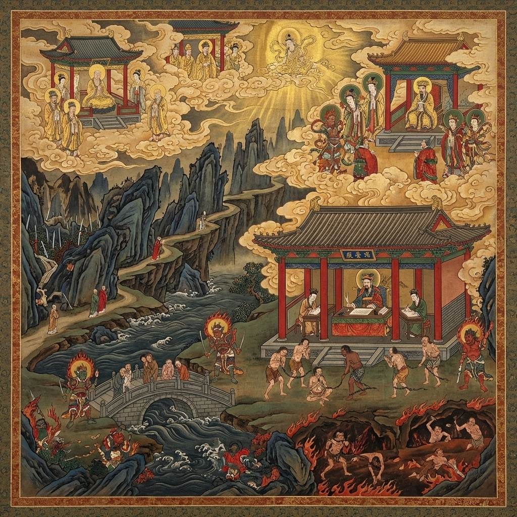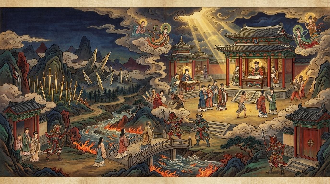 산바람이 전각의 문틈으로 빠져나가며, 지옥도 위의 주사 물감 냄새를 산 아래로 실어 나릅니다. 그 붉은 향기는 새벽 안개에 섞여, 어딘가에서 바느질을 하고 있을 또 다른 여인의 코끝에 닿을 것이옵니다.