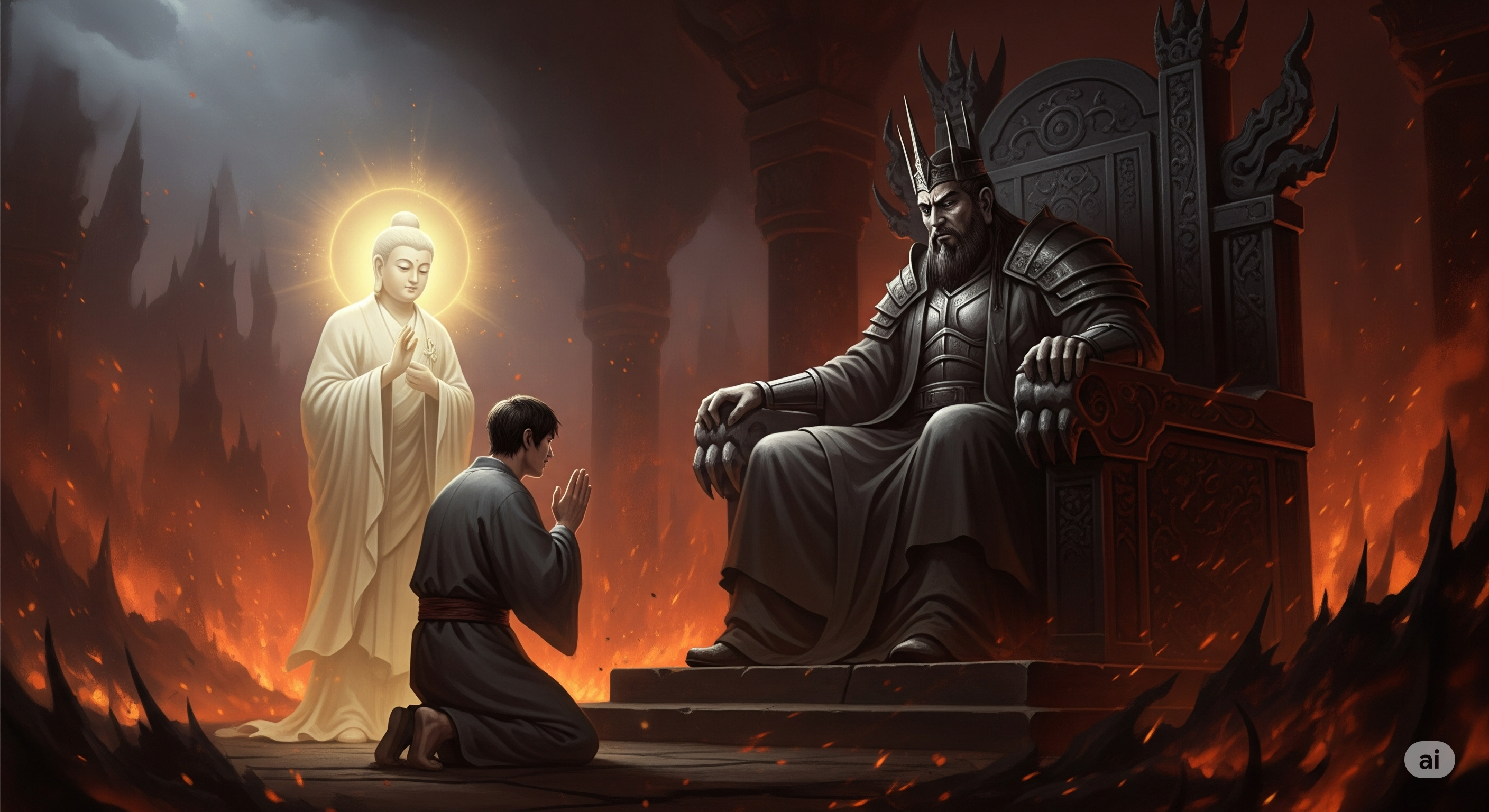 "지장보살!" 염라대왕이 지장보살의 말을 막았습니다. "당신도 지옥의 법칙을 잘 알고 있을 것이다. 개인적인 감정으로 법을 바꿀 수는 없다!"