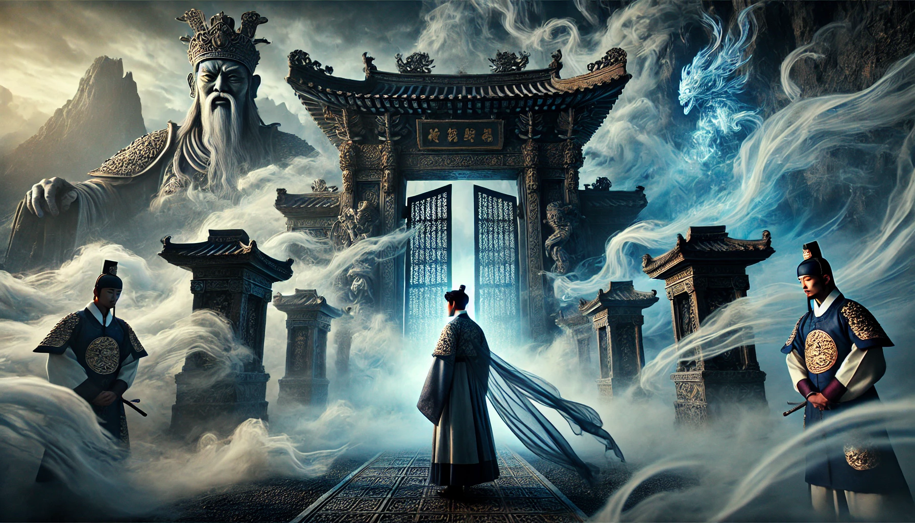 명부전 안의 모든 속삭임이 멈추었다. 진우의 심장(영혼이지만)이 빠르게 뛰기 시작했다. 높은 의자 뒤에서 한 인물이 나타났다. 그는 진우가 상상했던 것과는 달랐다.