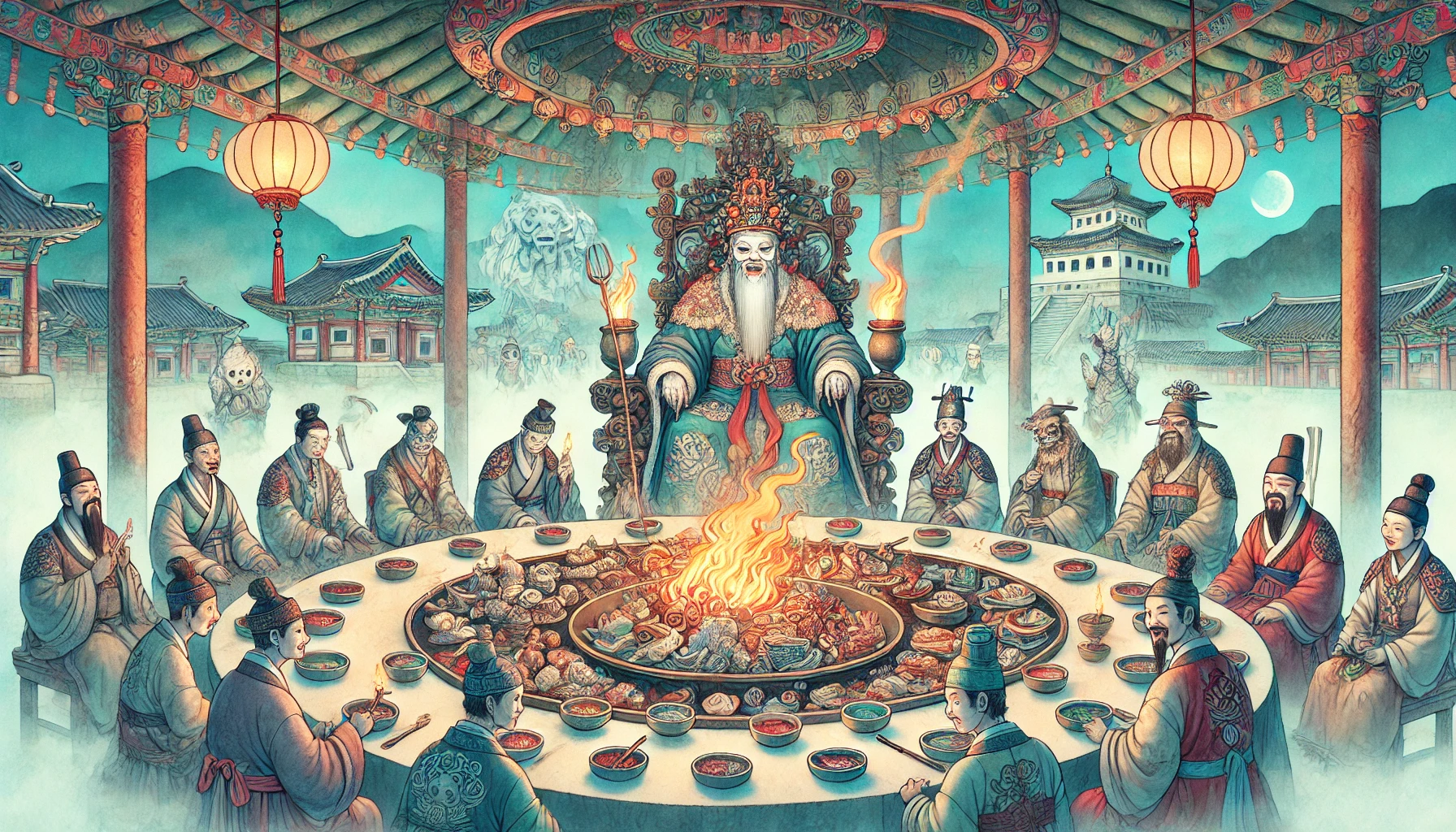 염라대왕이 손을 흔들자 상 위에 새로운 음식들이 나타나기 시작했습니다. 하지만 그 음식들은 정말 끔찍한 모습이었어요.