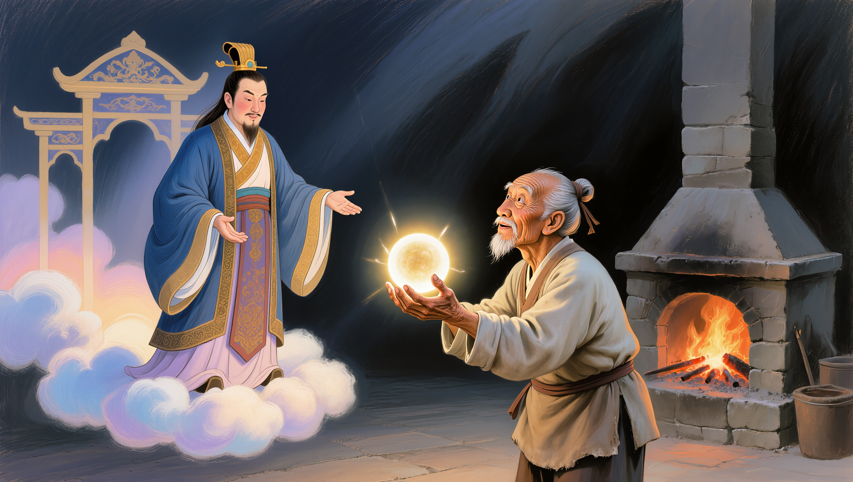 A soft pastel painting in a 16:9 aspect ratio. An elderly Korean blacksmith with a weathered face, dressed in worn traditional work clothes, looks up with a surprised and humble expression, holding a glowing, magical object (a small, radiant orb or a scroll emitting light) in his calloused hands instead of a hammer. Standing before him on a cloud is a benevolent, regal figure, the King of the Underworld (Yeomra), dressed in flowing, ancient robes with a gentle, wise smile, gesturing kindly towards the blacksmith. In the background, a fiery, old forge is visible on one side, contrasted with ethereal, soft clouds and a fantastical, traditional palace gate on the other. The colors are muted warm oranges, deep blues, soft purples, and gentle golds. No text.