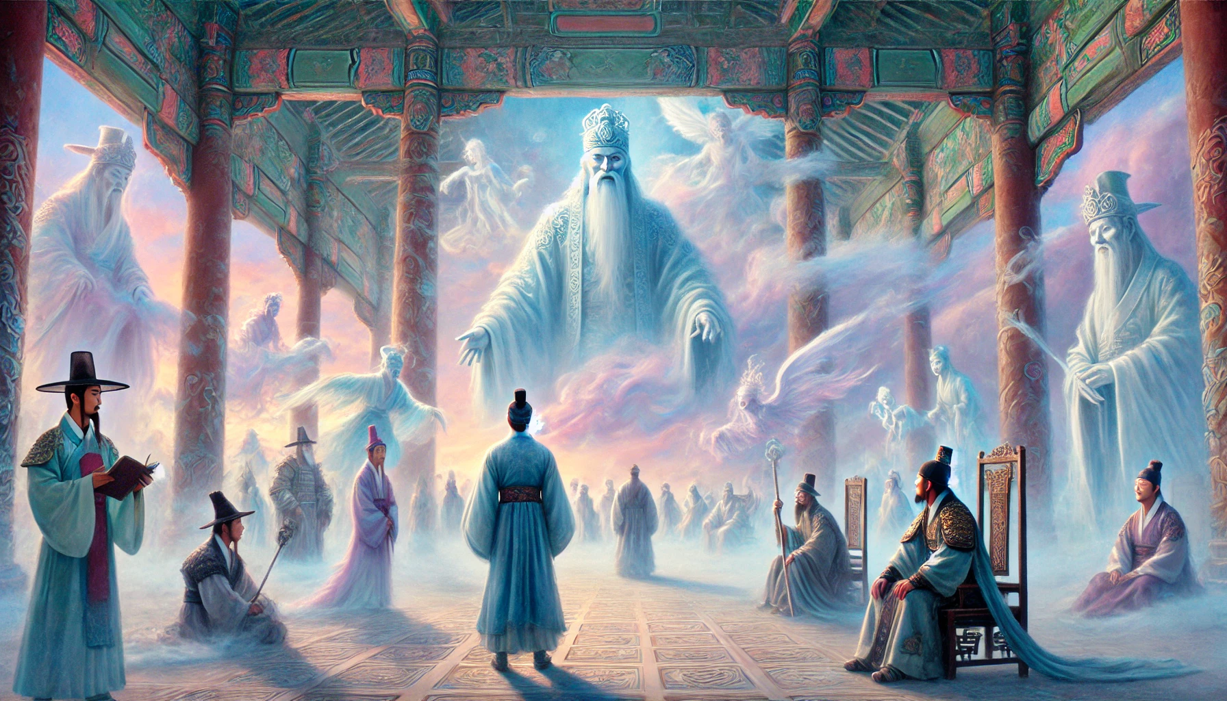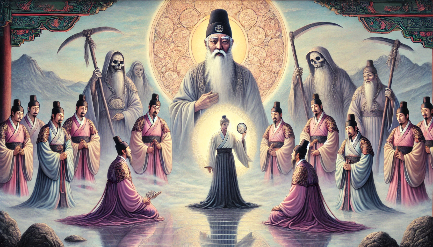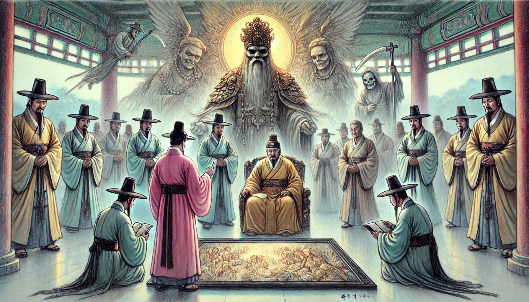 성문을 지나자 거대한 전각이 나타났습니다. 전각 안으로 들어가니, 높은 단 위에 위엄 있는 모습의 염라대왕이 앉아 계셨습니다. 얼굴은 엄숙했고, 눈빛은 날카로웠습니다. 양옆에는 수많은 관리들이 서 있었고, 앞에는 커다란 거울 같은 것이 놓여 있었습니다.