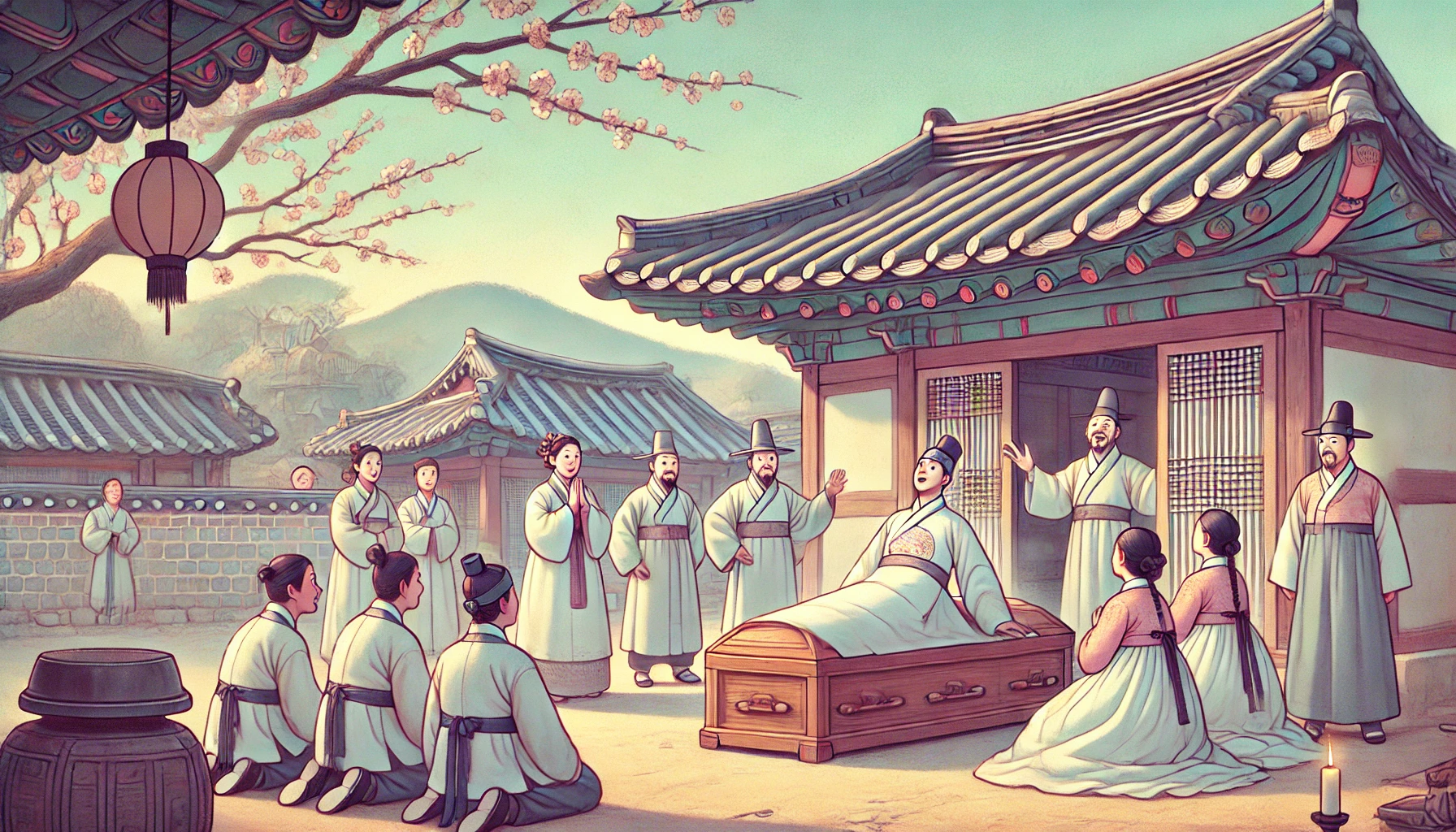 이 참봉의 영혼은 한 치의 망설임도 없이, 단단히 닫혀 있던 관 뚜껑을 그대로 '슈욱' 하고 통과하여, 사흘간 식어있던 제 육신 속으로 '쏙' 하고 빨려 들어갔습니다. 그 순간, 대청 기둥 뒤에 숨어 이 광경을 지켜보던 김 사자는, 하얗게 질린 얼굴로 두 손을 모으고 빌기 시작했습니다. '제발... 제발 살아나라! 저 뜨거운 양기로 육신을 데워라! 제발...!'