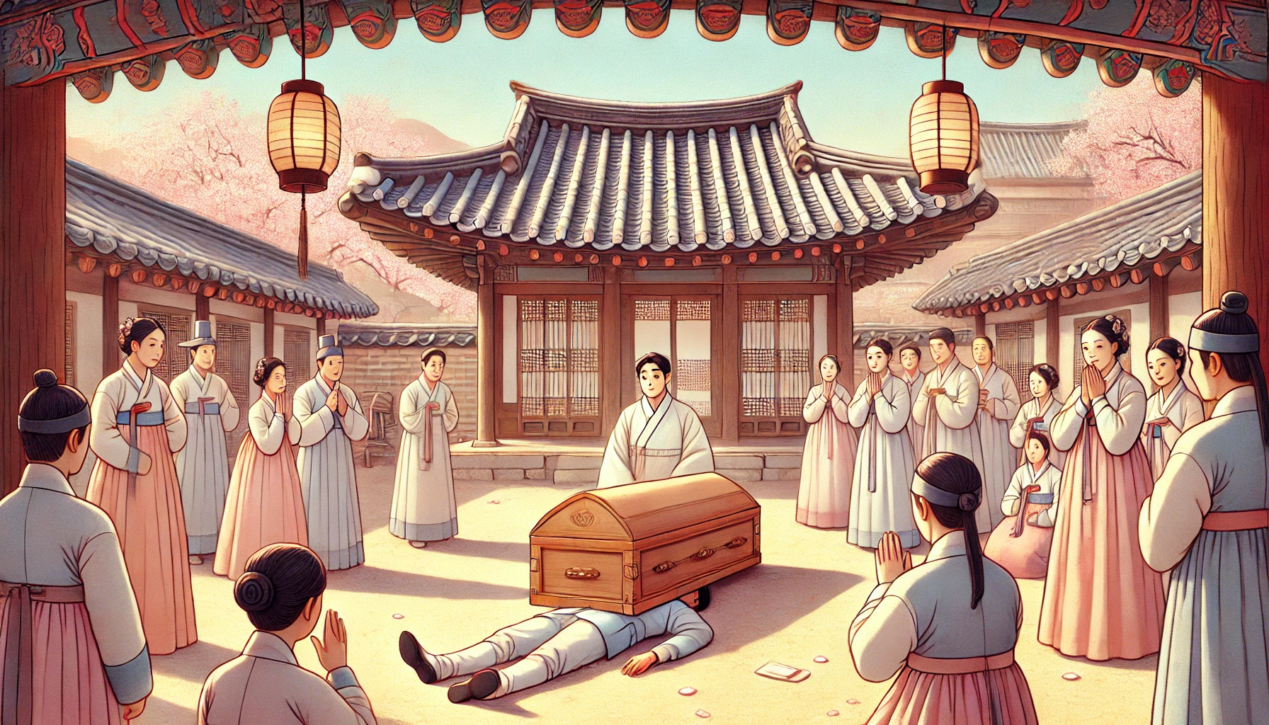 대청마루는 그야말로 눈물바다였습니다. 멍석이 깔려있고, 가사장삼을 걸친 스님들이 염불을 외고 있었으며, 아내 오 부인은 하얀 소복을 입은 채, 넋이 나간 모습으로 관(棺) 앞에 주저앉아 있었습니다. "아이고... 서방님... 불쌍한 우리 서방님..." 그녀의 애달픈 울음소리가 이 참봉의 영혼을 후벼 팠습니다.